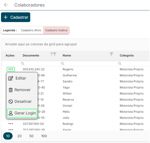- Cadastrar o Usuário: Após o colaborador estar devidamente cadastrado, clique nos três pontos (ações) ao lado do colaborador e selecione a opção "Gerar Login":