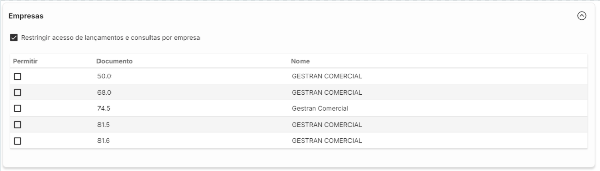 - Empresas: também em casos de licenças com Matriz e Filiais, é possível determinar a quais empresas do grupo o usuário terá permissão para realizar lançamentos e consultas: