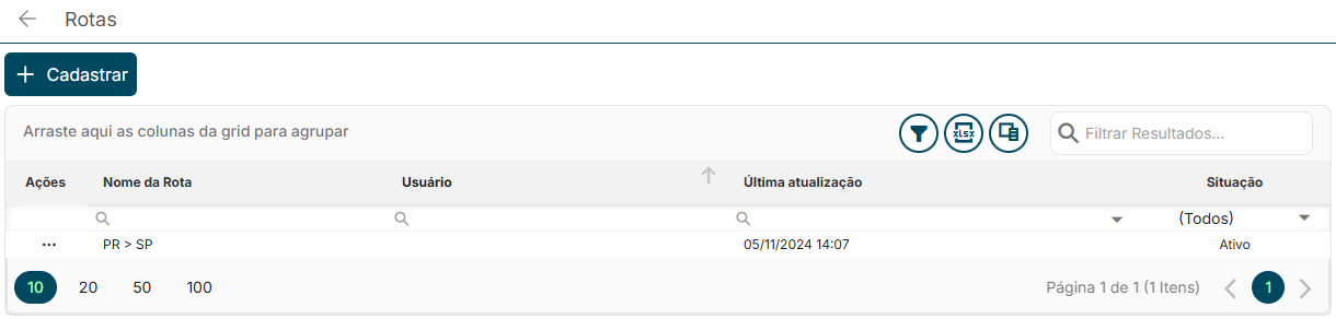 Ao acessar, serão exibidas as rotas já cadastradas com a data e o usuário da última atualização e a situação da rota: ativa ou inativa.