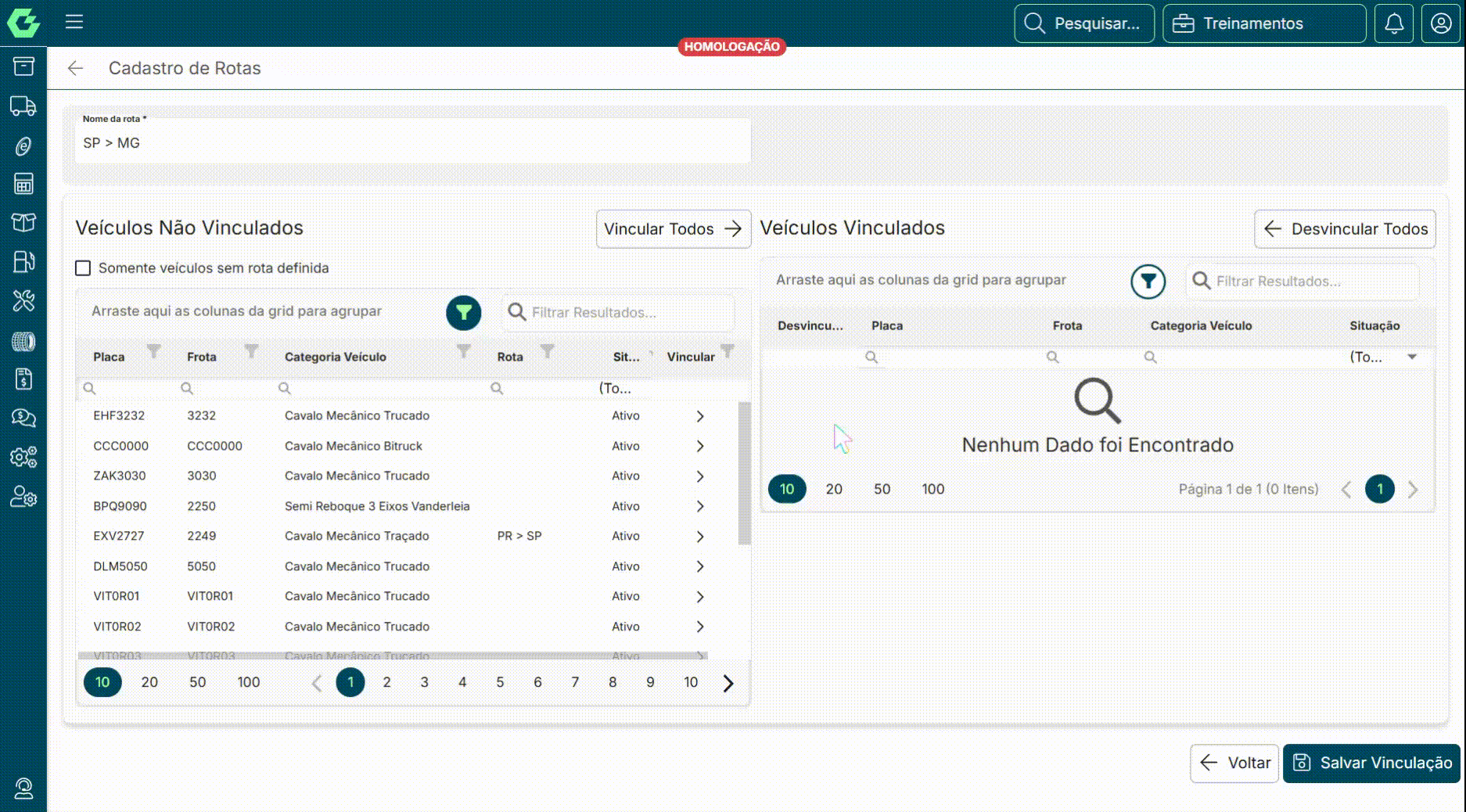 - Salvamento: Após inserir o nome da rota e vincular os veículos desejados, clique em “Salvar Vinculação” para concluir o cadastro.